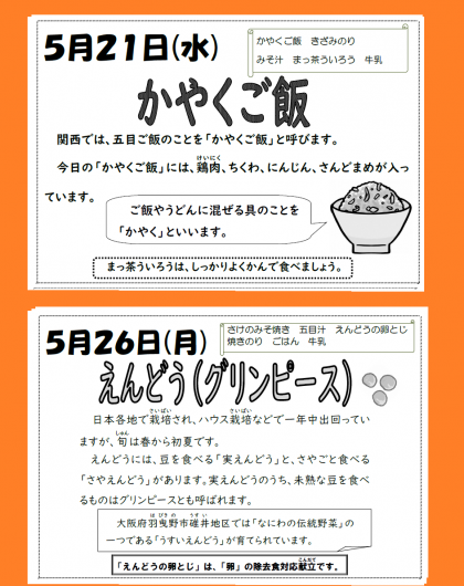 来週26日(月)の給食では、「さけのみそ焼き・五目汁・えんどうの卵とじ【除去食:卵】・焼きのり・ごはん・牛乳」が提供されます。お楽しみに。