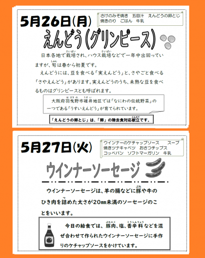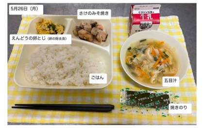本日の給食では「さけのみそ焼き・五目汁・えんどうの卵とじ【除去食:卵】・焼きのり・ごはん・牛乳」が提供されます。しっかりと給食をいただいて、健康の保持増進に努めましょう。