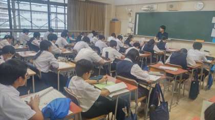 こちらの教室では、担任の先生が、以前受け持たれたクラスの学級旗を掲示して、生徒たちにイメージしやすくしていました。生徒たちはこれから用紙を受け取って、思い思いにデザインしていきます。