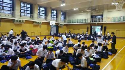 先生方からのお話の後、体育館を前後に分割し、男女それぞれで忘れ物点検を行いました。しおりを見て入念に準備したはずですが、いざみんなで点検すると、忘れ物をしている生徒が何人か出てきました。中には、着るものを忘れている人もいて、出発前にわかってよかった!と一安心する場面も。