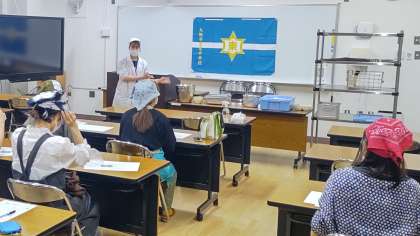 最初に栄養教諭の先生から説明があり、保護者の皆さんも生徒と同じ行程でエプロンや三角巾を着装して配膳に取りかかりました。