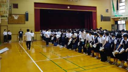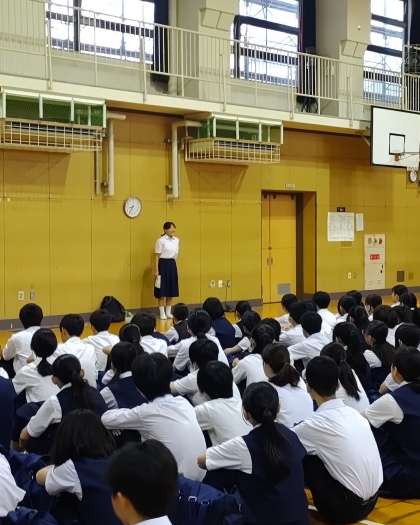 写真は出発式の様子です。校長先生が修学旅行で不在のため、副校長先生からお話があったあと、代表生徒からお話がありました。「これまで学んできたことをいかして頑張りましょう!」という力強いメッセージが聞けました。