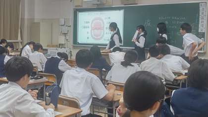 二枚目は、2年生の理科の授業です。先週の授業でタブレットPCを使って調べ学習と発表原稿づくりをしていた生徒たちが、今日はクラス内で披露・発表する機会を持ちました。写真の班は、「歯」について発表しています。周りの生徒は聞くだけでなく、内容や気になることをどんどんプリントに書き込んでいました。
