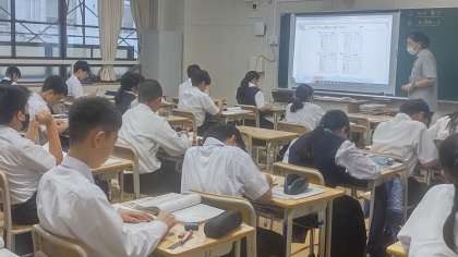 一枚目は、3年生の保健の授業です。テーマは室内の空気の衛生的管理について、でした。教科書を順に音読していましたが、外国籍の生徒が当たると、本人が一生懸命読むだけでなく、周りからも漢字の読み方をサポートする姿が見られました。困っている生徒を支えてくれる優しさ、うれしく思いました。