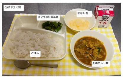本日の給食では「和風カレー丼・オクラの甘酢あえ・和なし(缶)・牛乳」が提供されます。しっかりと給食をいただいて、健康の保持増進に努めましょう。