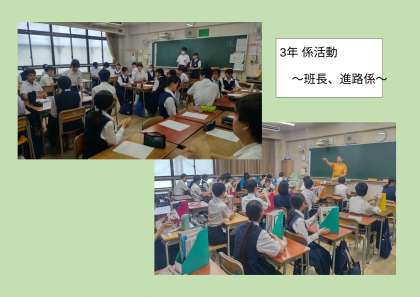 3年生は、班活動の一環として係会議を行いました。写真は班長会議と進路係会議の様子です。