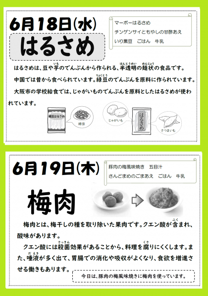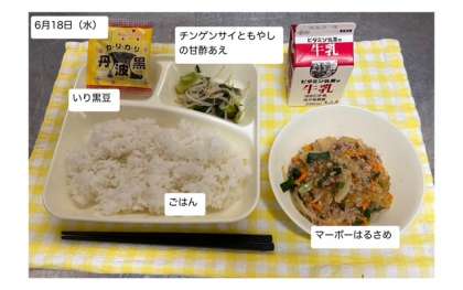 本日の給食では「マーボーはるさめ・チンゲンサイともやしの甘酢あえ・いり黒豆・ご飯・牛乳」が提供されます。しっかりと給食をいただいて、健康の保持増進に努めましょう。