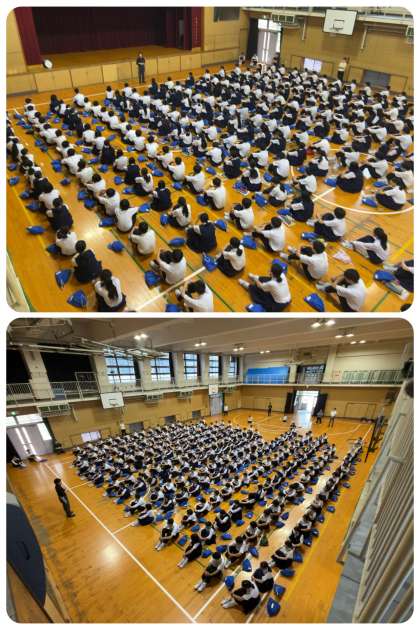 2年生が朝の学年集会をしました。『過去に担当していた部活動で、関わっていた生徒が試合で成長した姿を見れたのは、陰の努力の成果でした』というお話から、夢や目標に向かって、自分で考えて行動することの大切さをお話されました。