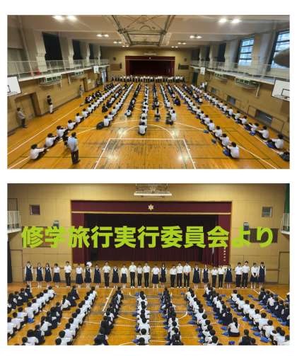 まず初めに修学旅行実行委員会を代表して、実行委員長から、修学旅行のまとめと今後の決意が述べられました。スピーチ後には、メンバーに対する感謝の気持ちからか、自然に拍手が起こり、体育館が温かな空気に包まれました。