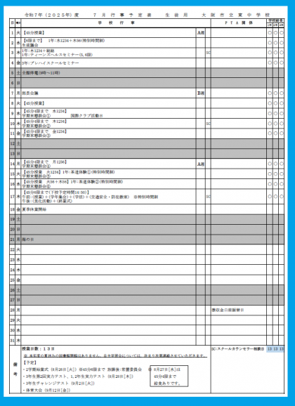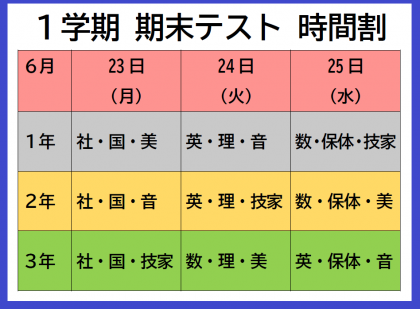 さて、期末テストの時間割と7月の行事予定表を掲載します。