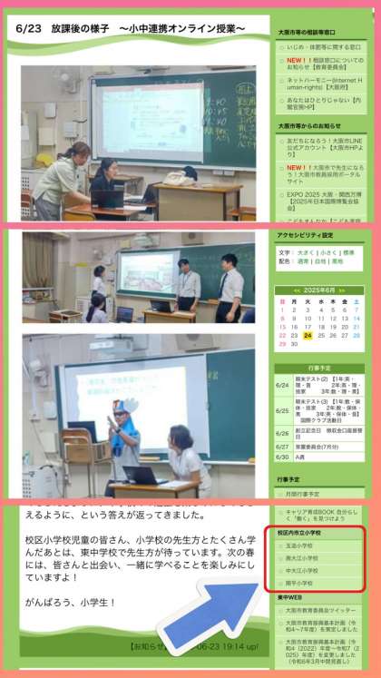 小中連携オンライン授業の様子は、校区小学校のホームページにも掲載していただきました。ありがとうございました。小学校の記事には次のように紹介していただきました。