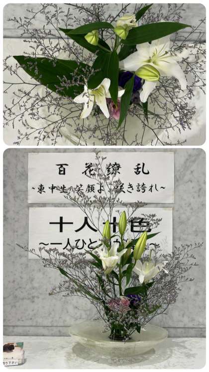 玄関のお花を生け替えていただきました。お題は、「雲海」、お花は「ユリ・トルコキキョウ・カスピア」です。いつもありがとうございます。
