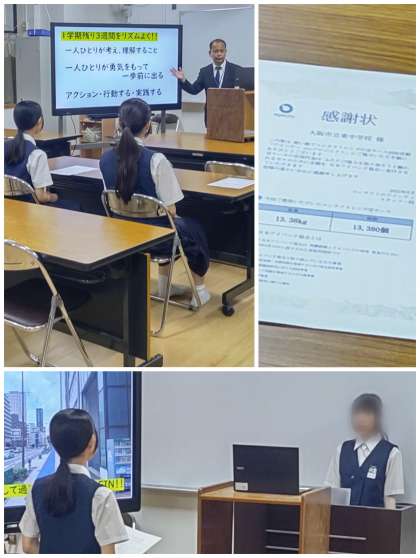 初めに賞状伝達が行われました。東中学校の生徒全員に向けた賞状を、代表して生徒会が受け取ってくれました。賞は、使い捨てコンタクトレンズのケースをたくさん集めたことへの感謝状です。