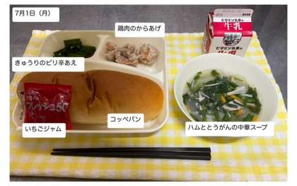 本日の給食では「鶏肉のからあげ・ハムととうがんの中華スープ・きゅうりのピリ辛あえ・コッペパン・いちごジャム・牛乳」が提供されます。しっかりと給食をいただいて、健康の保持増進に努めましょう。