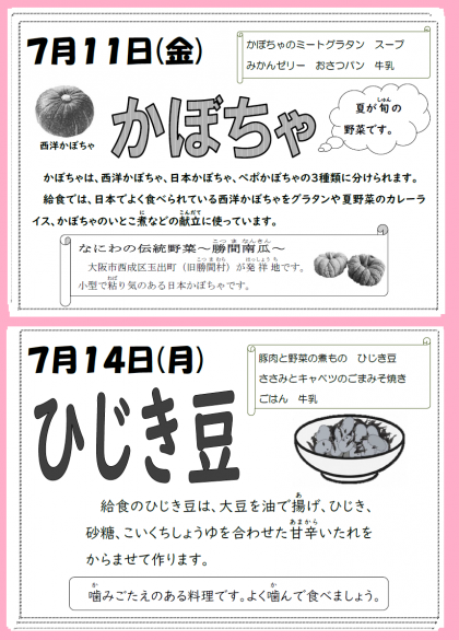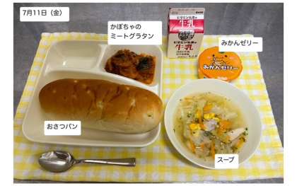本日の給食では「かぼちゃのミートグラタン・スープ・みかんゼリー・おさつパン・牛乳」が提供されます。しっかりと給食をいただいて、健康の保持増進に努めましょう。