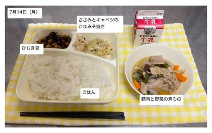 本日の給食では「豚肉と野菜の煮もの・ひじき豆・ささみとキャベツのごまみそ焼き・ごはん・牛乳」が提供されます。しっかりと給食をいただいて、健康の保持増進に努めましょう。