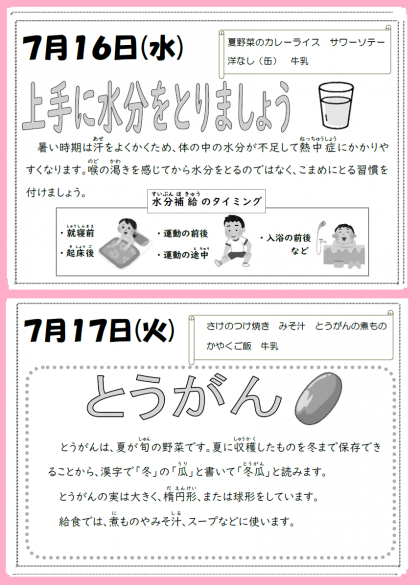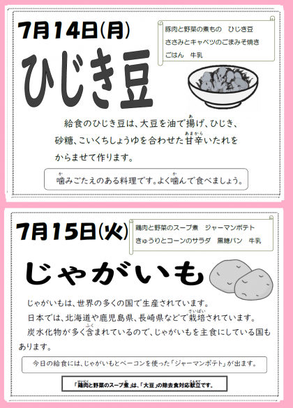 明日は「鶏肉と野菜のスープ煮・ジャーマンポテト・きゅうりとコーンのサラダ・黒糖パン・牛乳」が提供されます。お楽しみに。