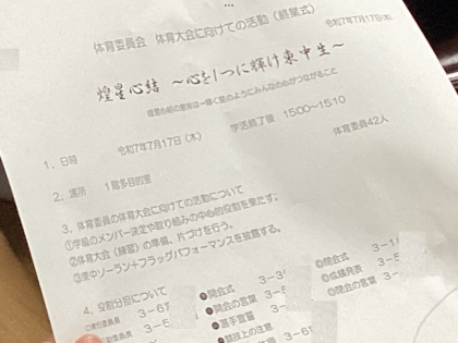 『煌星心結』の意味は「輝く星のようにみんなの心がつながること」。体育委員会の42人のメンバーが800人を超える東中生のリーダーとして、9月12日(金)にAsueアリーナ大阪で開催される体育大会を成功に導いてくれることを期待しています。