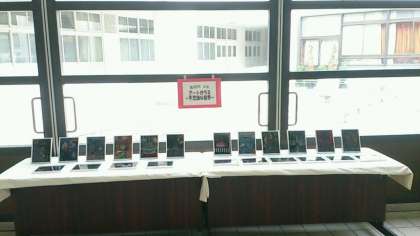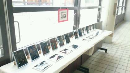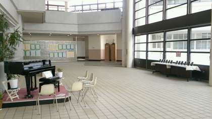 東中ホールには、2年生美術科の授業で制作された作品が展示されています。また、ホール奥には、体育科の授業で行った長距離走の結果、大阪城マラソン大会の結果も掲示されています。静寂な東中ホールに設置されたピアノを始め、芸術、文化にあふれた東中の顔である玄関は東中生をいつも温かく迎えてくれています。