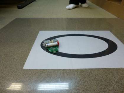 これは、紙に描かれた黒いラインにそって、はずれることなく車を走らせるためのプログラムを組むというものです。