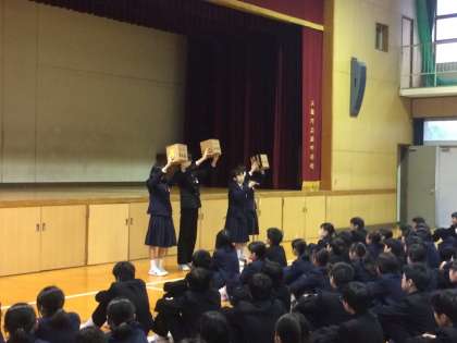 今日は体育館で行われました。旧生徒会役員から意見箱の設置に関して報告がありました。