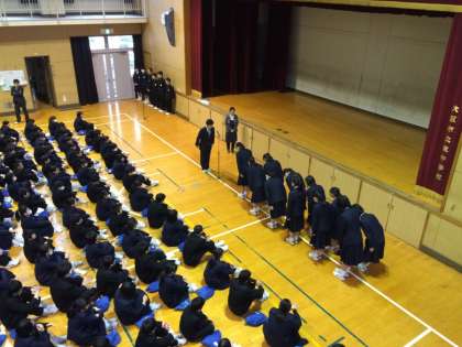 3年生が卒業したため、いつもより広く感じる体育館に寂しさを感じながらも、今日は1、2年生だけで全校集会を行いました。