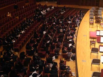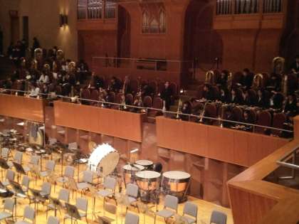 吹奏楽部は今日は朝からシンフォニーホールに来ています。大阪フィルとの共演です。舞台に出る人もいますが、客席でも演奏できるようにスタンバイです。