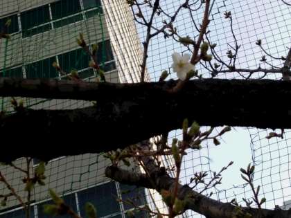 さて、ごらんのとおり東中学校の桜はまだ花一輪で、開花とはいきません。しかし、南門の上にある桜はかなり花が咲いています。また通った時に見てください。