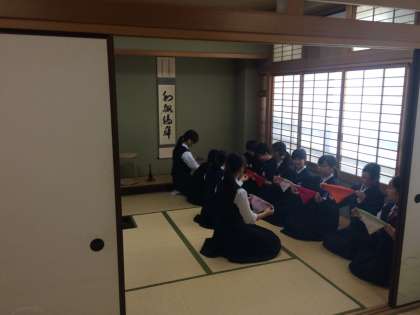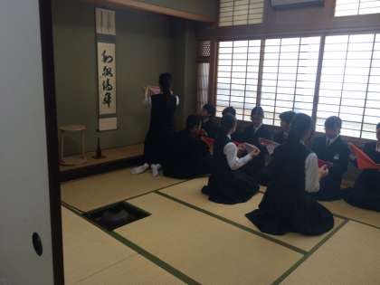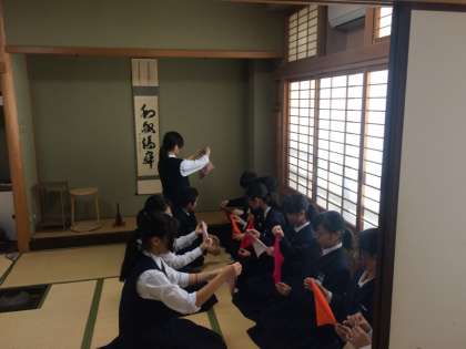 茶道部では先輩が袱紗捌きの見本を見せながら丁寧に教えていました。上手にできたかな?
