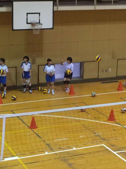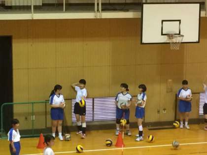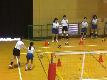 バレーボール部はサーブ練習で一年生に見本を見せながらアドバイスをしていました。
