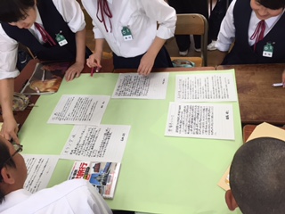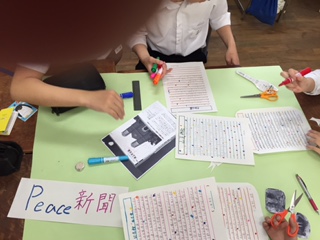 それぞれが書いてきた原稿を貼り合わせるために、配置を考えます。また、挿絵を入れたり、デコレーションしたりと、それぞれのクラス、それぞれの班で工夫が凝らされていました。