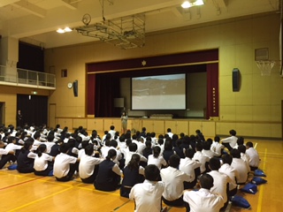 本日(5月30日)一限目に、3年生は人権学習の1回目、そして修学旅行の事前学習として、「長崎の原爆」に関するビデオを見ました。3年生の生徒及び教職員全員が、真剣な表情で学習していました。戦争と原爆の悲惨さ、つらさがひしひしと伝わってくる内容でした。修学旅行当日を心して迎えよう、そう感じさせられたビデオでした。