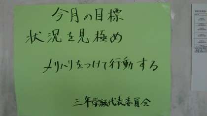 廊下には今月の学年目標を掲示されていました。全員が努力し、達成してください!!