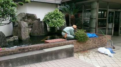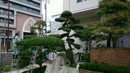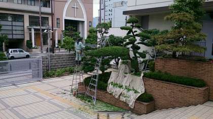 管理作業員さんが、東中正門から玄関ホールにかけて、剪定作業に汗を流していただいています。
