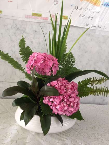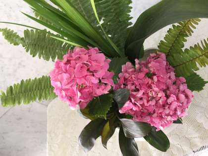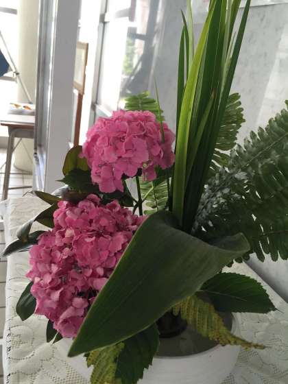 今回は「葉々の語らい」というタイトルで、あじさい、玉しだ、ハラン、ドラセナ、菖蒲の葉を使った作品です。