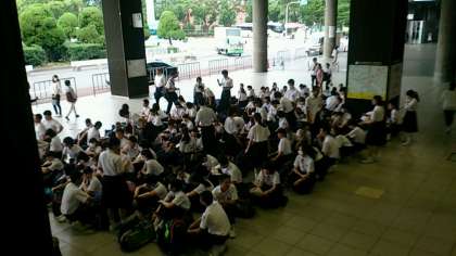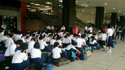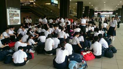 只今、7時5分です。集合完了5分前となりました。修学旅行実行委員の呼びかけで、ほぼ集合・整列できています。