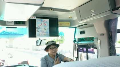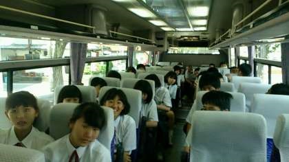 バスガイドさんのご案内が始まり、バスが出発しました。ガイドさんのご質問に、元気に積極的に反応しています。