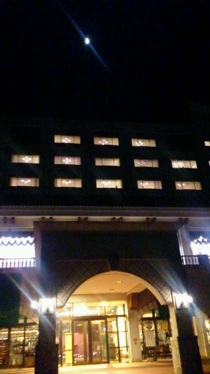 只今、21時37分です。各部屋では就寝準備、同時に室長会議や明日に向けての係会議が行われています。そんなホテルを外から観てみました。空には三日月が明かりを照らしています。なかなかきれいです。明日は晴れる!!
