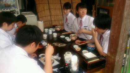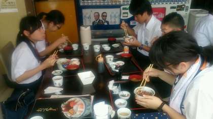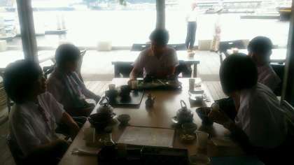出島のチェックポイントを通過後、長崎港の海鮮店で豪華ランチを食べている班を発見!