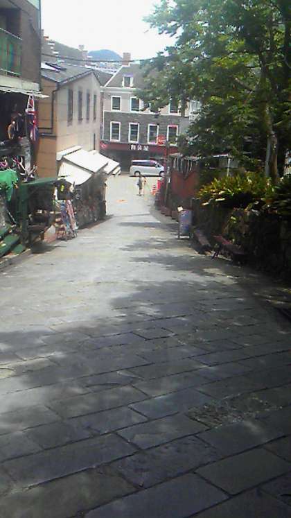 これはグラバー園に行くための坂道の終わりあたりです。坂道の両側には、お土産を売る店が、ぎっしりならんでいます。ちなみに、映像の真ん中辺りの右側が入り口で、入り口からも石段があり、それを登り切るとやっと入場ゲートです。