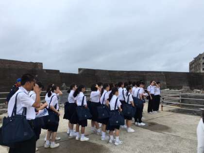 軍艦島に上陸しました!雨も現在降っておらず、無事に見学できています。ガイドさんのお話を真剣に聴いています。