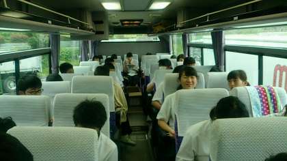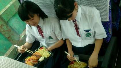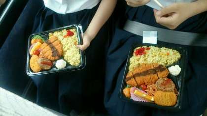 軍艦島では降らなかった雨が、長崎港に寄港した頃から、強く降っています!そのため昼食は大村湾サービスエリアでバス内の昼ごはんとなりました。船酔い気味の人もいましたが、長崎名物のトルコライス、みんな気づいていない?かなりボリュームある弁当をしっかり食べています。