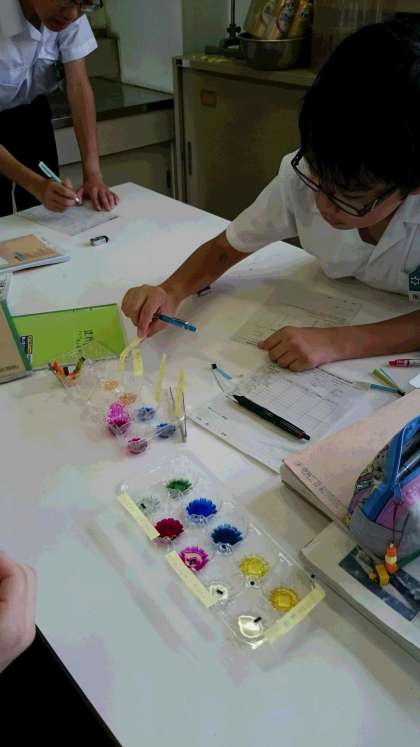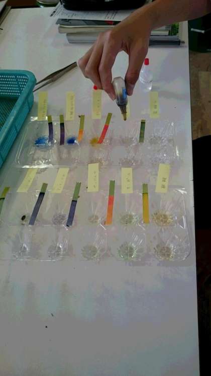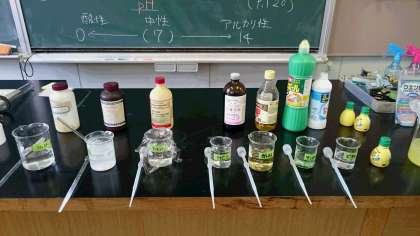 3年生の理科実験の様子。身近な水溶液の酸性アルカリ性を調べました。