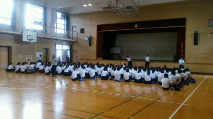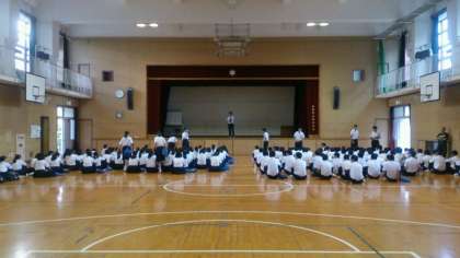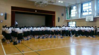 2学期最初の学年集会です。さすがに3年生!整然としています。学年集会の本題に入る前に、風紀委員による風紀点検が行われています。