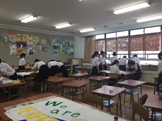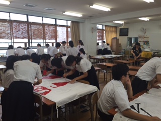 美術室での学級旗作りの様子です!各クラスから5〜6名ずつくらい集まり、筆をとっています。