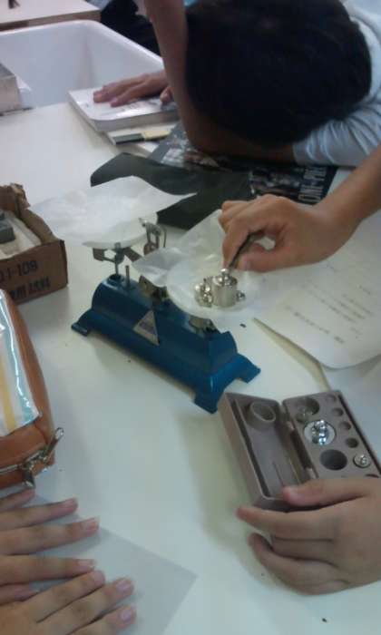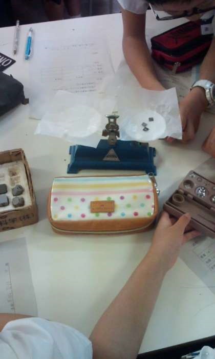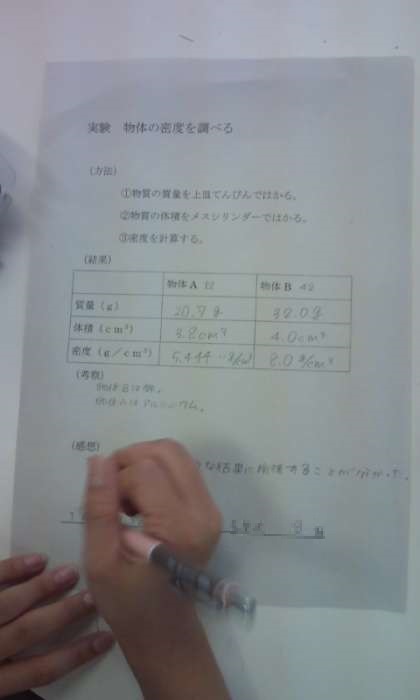 質量は上皿てんびんで、体積はメスシリンダーを使って測定し、それぞれの密度を算出していました。