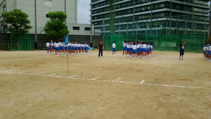 学年演技「台風の目」の前に学年が心をひとつに!団結力を高めていくために、心を込めて、大きな声で、かけ声の練習をしています。