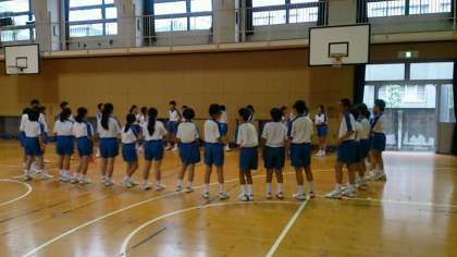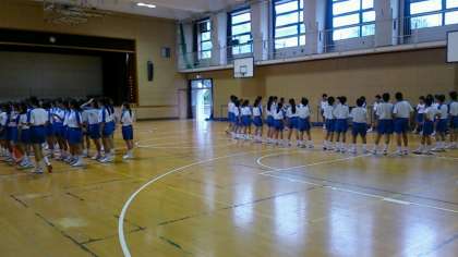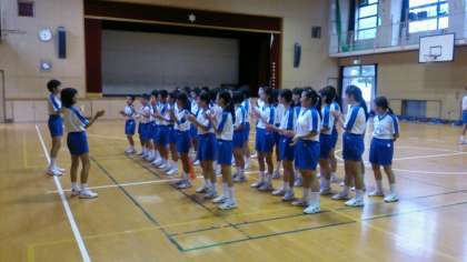今日は朝からの雨で運動場が使用できないため、体育館で応援練習をしています。1年生は初めての体育大会になりますが、応援団長を中心に各クラスがまとまって一生懸命に声を出しています。