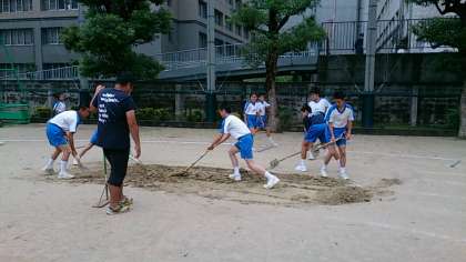 各係りに別れ、一斉に準備が始まりました。心配されたグランドコンディションですが、少し水溜まりはありますが、ほぼ乾いた状況で、凄い水はけの良さに驚きです。さらに東中生の復旧作業と設営作業で、会場が整ってきました!