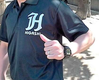 校長先生が着ているのは、特注赤プリント長袖ポロシャツです。